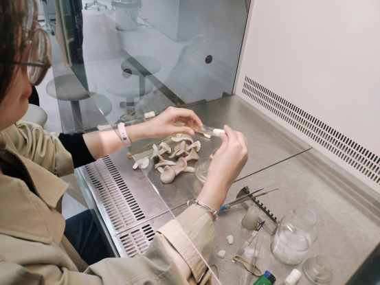 如今实训室的架子上,一排排培养瓶静静孕育着生机,有的刚完成接种静待苏醒,有的已长出绒毯般的白色菌丝。同学们每天认真记录温度、生长速度与状态变化,在毫厘不差的操作和翔实准确的记录中,夯实新农人的专业根基,见证着生命从无到有的生长规律。
