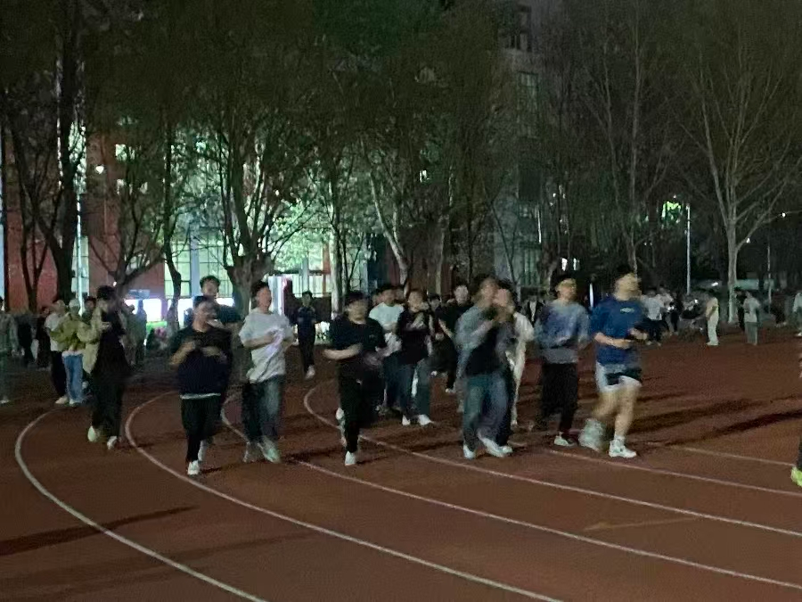 随着一声发令,同学们冲出起点,队伍穿梭在夜色中形成了一道流动的光影风景线大家在春夜的微风中追逐着光影享受着奔跑带来的自由与释放。同学们的身影好似灵动的音符,在跑道上轻快跃动;结伴而行的伙伴们,一个个矫健的身姿,汇聚成勇往直前的力量。